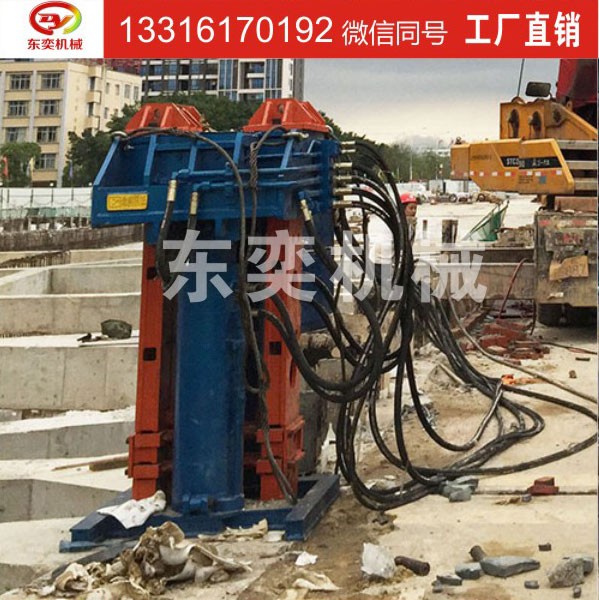 工作原理: 工法型鋼拔樁機利用其夾樁器夾住樁頭,液壓缸強制頂壓夾樁器,使之向上頂升一段距離,將樁逐段拔出,適用在粘土、砂土或含少量礫石的土層中拔工字鋼或型鋼樁。