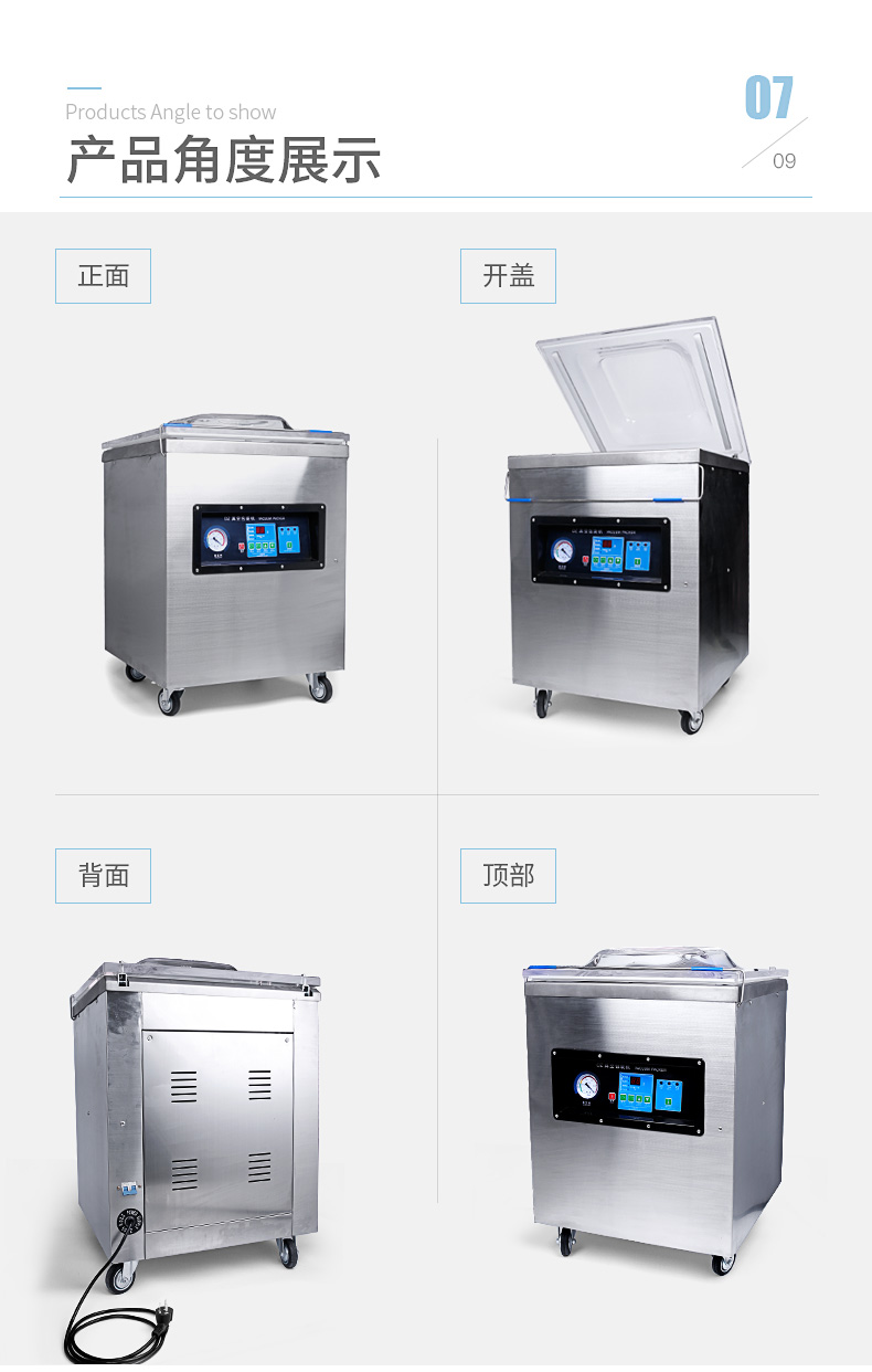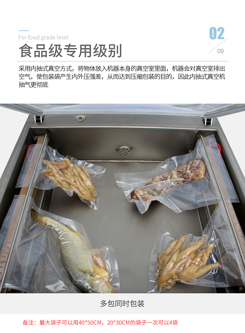 真空包裝機適用于食品行業可包裝火腿、肉類、魚干、雞鴨肉類、醬制品、調味品、果脯、糧食、豆制品、化學制品、藥材、農產品、電子、五金零件等商品進行真空后充惰性氣體包裝,經抽真空包裝后的物品可防止氧化、霉變、蟲蛀、受潮、延長產品儲存期限。