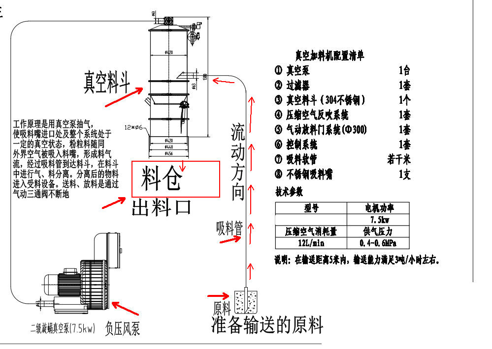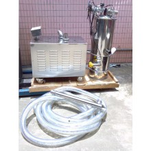 旋渦真空加料機是用真空泵抽氣,使吸料嘴進口處及整個系統處于一定的真空狀態,粉粒料隨同外界空氣被吸入料嘴,形成料氣流,經過吸料管到達料斗,在料斗中進行氣、料分離。分離后的物料進入受料設備。送料、放料是通過氣動三通閥不斷地開、閉來完成的,而氣動三通閥的開閉是由控制中心來控制的。真空加料機中裝有壓縮空氣反吹裝置,每次放料時,壓縮空氣脈沖反吹過濾器,把吸附于過濾器表面的粉末打落下來,以保證吸料能正常運行。 旋渦真空加料機由真空泵(無油、無水)或者羅茨風機、不銹鋼吸料嘴、輸送軟管、PE過濾器(或316L不銹鋼過濾器)、壓縮空氣反吹裝置、氣動放料門裝置、真空料斗和料位自動控制裝置等組成,整套系統設計合理、制造精美。 旋渦真空加料機是用旋渦氣泵抽氣,使吸料嘴進口處及整個系統處于一定的真空狀態,粉粒料隨同外界空氣被吸入料嘴,形成料氣流,經過吸料管到達料斗,在料斗中進行氣、料分離。分離后的物料進入受料設備。送料——放料是通過氣動三通閥不斷地開、閉來完成的,而氣動三通閥的開閉是由控制中心來控制的。 真空加料機中裝有壓縮空氣反吹裝置,每次放料時,壓縮空氣脈沖反吹過濾器,把吸附于過濾器表面的粉末打落下來,以保證吸料能正常運行。  該機是國內最為先進、理想、完善的粉狀料、粒狀料、粉粒料混合料的真空輸送設備。真空加料機能自動地將各種物料輸送到包裝機、注塑機、粉碎機等設備的料斗中,也能直接把混合的物料輸送到混合機(如V型混合機、二維混合機、三維混合機等)中,減輕了工人勞動強度,解決了加料時粉塵外溢等問題,是制藥廠、食品廠通過GMP認證、促進清潔、文明生產的首選設備。  旋渦真空加料機技術參數二.   型號 輸送量kg/h 電機功率 (KW) 耗氣量L/MINS 供氣壓力(Mpa) 料斗直徑(MM) 吸料口直徑(MM) 放料口直徑(MM) 料斗高度(MM) DZKs-1 400 1.5 8 0.4-0.6 ¢213 ¢38 ¢241 560 DZKs-2 600 2.2 8 0.4-0.6 ¢213 ¢38 ¢241 720 DZKs-3 1200 3 8 0.4-0.6 ¢290 ¢51 ¢325 850 DZKs-4 2000 5.5 8 0.4-0.6 ¢420 ¢51 ¢325 二、調試安裝 1、上料機的料斗一般固定在真空泵小車的立柱上,可上下移動,按受料設備的高度,調整好上料機料斗的位置。對受料設備(如包裝機)料斗較高時,需另做支架固定真空上料機的料斗。 2、用軟管把吸料嘴與料斗、料斗與真空泵連結好,并用喉箍卡緊。 3、接好電源。電源應采用三相五線制的電纜線,因為控制電路需要“工作0”,為了安全仍需要“保護0”,”保護0“的另一個作用是消除物料輸送時產生的靜電對控制芯片的干擾,造成控制系統死機。因此‘保護0”必須接上。 4、用 Φ 6壓縮空氣管插入系統進氣口(過濾減壓上),調整減壓閥,保證系統的壓力維持在0.6M pa,并按接管圖將小車上壓縮空氣接頭與真空料斗上氣缸的壓縮空氣接頭連接上。 5、接通電源,打開箱門,合上三相空氣開關,此時控制盒上上料時間、放料時間顯示器亮。 6、調整上料時間、放料時間。通過觸摸增、減按鈕將上料時間設定在10-30秒,將放料時間設定在4-8秒。 7、按下開/關按鈕,接通旋渦氣泵。檢查真空泵的轉向,若排風口無風排出,則電動機為反轉,關掉開/關按鈕,調換電源的接線相序,直至氣泵轉向正確為止。 8、按下開/關按鈕,啟動旋渦氣泵,將吸料嘴插入料箱中,隨即開始送料。吸料——放料(同時壓縮空氣反吹過濾器)為一個工作循環。真空加料機將自動循環下去,直至受料設備(如包裝機)料斗中的料加滿(此時料位開關亮)為止。 9、受料設備料斗中料位低于料位開關時,氣動三通閥自動換向,系統重新進入吸料-放料循環,直至料斗中的料加滿。 10、物料輸送過程,由于摩擦原因會產生較大的靜電,為了消除靜電,應考慮對設備外殼可靠接地。 11、真空加料機采用了新型微孔膜過濾器,大幅提高了機器的加料能力和使用壽命。微孔膜過濾器的合理清洗對真空加料機的使用性能致關重要。清洗微孔膜過濾棒時我們建議按以下步驟進行: 1)用壓縮空氣反吹過濾棒表面的粉塵。 2)用不超過80℃的熱水沖刷過濾棒的表面,或浸泡一定時間,用細毛刷刷凈過濾棒的表面,注意絕不能用硬毛刷刷凈過濾棒的表面,否則過濾棒表面將起毛,并且影響過濾棒的精度。 3)自然晾干或放在烘箱中烘干,烘箱溫度不能高于50℃。只有充分干燥后的過濾器才能被允許裝回機器上使用。   三、故障排除 如發現系統不上料,按以下程序檢查 1、電源相序接錯,真空泵反轉。 2、壓縮空氣管總截門沒打開,系統沒有壓縮空氣,氣動三通閥無法工作。 3、系統漏氣。 4、氣動三通閥的電磁換向閥失靈。 5、氣動三通閥的橡膠閥片破裂。 6、布袋堵塞嚴重須清洗或更換。 7、控制系統出現死機。關掉電源重新啟動即可。出現死機的原因是電腦芯片受到干擾,為了消除干擾應對設備外殼可靠接地。 3KW7.5KW       旋渦風泵7.5KW型號