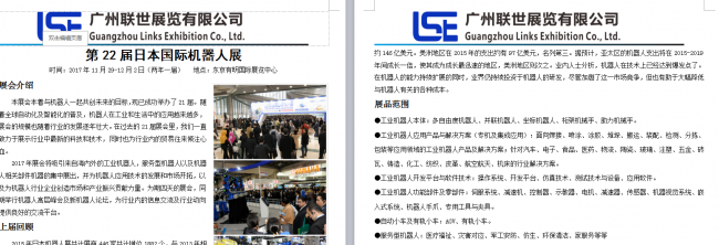 為促進我機器人企業(yè)拓展海外市場,應日本機器人工業(yè)會和日刊工業(yè)新聞社邀請,我司聯(lián)世展覽將擬于2017年11月27日-12月3日再次組織企業(yè)赴日本參加、參觀“2017日本國際機器人展覽會”并進行技術考察。在日期間主要日程包括: