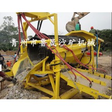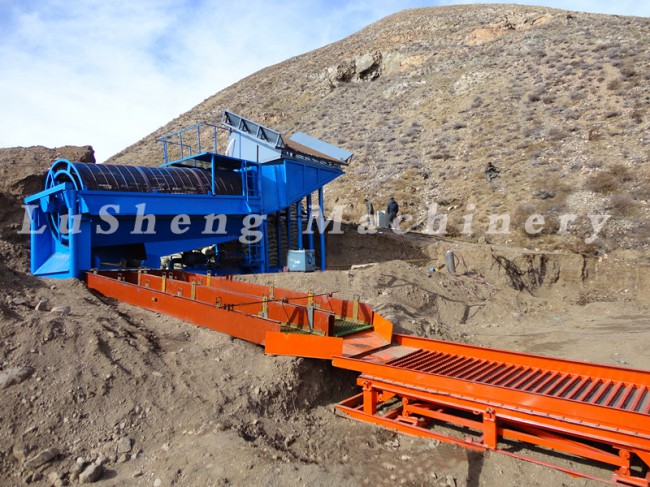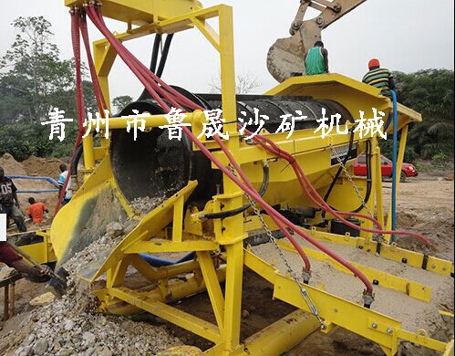 砂金洗礦機(jī)利用旋轉(zhuǎn)的圓筒和內(nèi)部的刮板以及物料中自有的卵石和巖石來分解粘土,塊狀物和軟氧化物。洗礦機(jī)的圓筒慢慢地旋轉(zhuǎn),類似于一個(gè)巨大的洗衣機(jī)。粗細(xì)不同的物料還有水同時(shí)在一起翻滾攪動(dòng),有效地把有用礦物從泥性土壤,粘土中釋放出來.分散均勻后漿狀般的物料被圓筒送到尾端,并從溢流口排到錐形篩進(jìn)行篩分.錐形篩把大粒度且無價(jià)值的物料排除,篩下的礦漿即可直接進(jìn)入各種選礦設(shè)備,如水套離心機(jī),鼓動(dòng)溜槽,蠕動(dòng)溜槽,自動(dòng)選金機(jī)等。