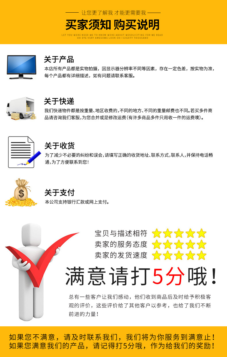 1、關(guān)于產(chǎn)品質(zhì)量:網(wǎng)絡(luò)交易,誠(chéng)信為王。作為淘寶店鋪的戰(zhàn)略合作伙伴,我們對(duì)產(chǎn)品的要求和把控極其嚴(yán) 格,所有的產(chǎn)品在出貨前均會(huì)經(jīng)過(guò)采購(gòu)、QC、倉(cāng)管相關(guān)人員的三次質(zhì)檢,確保發(fā)貨到您手里的產(chǎn)品是合格產(chǎn)品,萬(wàn)一產(chǎn)品有質(zhì)量問(wèn)題(貨流量大,疏漏在所難免,在此深表歉意),請(qǐng)?zhí)峁﹫D片證據(jù),并在48小時(shí)內(nèi)反饋。