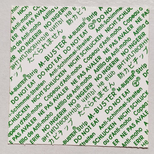3.請將未使用完畢的M-BUSTER防霉貼片存放于包裝袋內并盡快用透明膠紙密封保存,并于一
