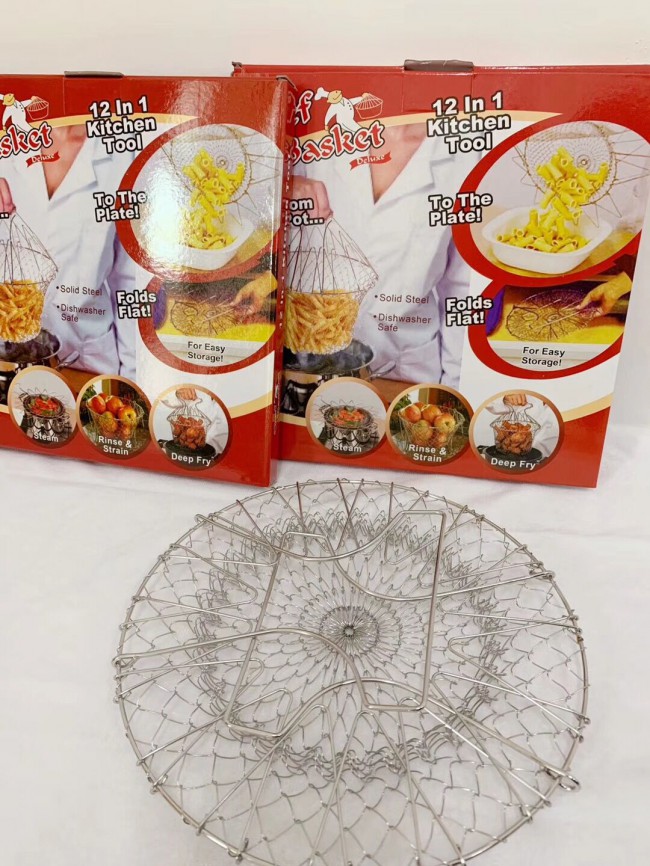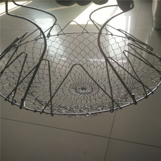 不銹鋼折疊籃子又叫廚師籃,用途 ,是酒店,飯店,家庭煮婦的好幫手,這種新產品既可以用來油炸食物,又可以蒸煮各種蔬菜肉類,清洗各種水果,既方便又美觀占地空間小,又可以折疊放置 ,不但是廚房品,又是工藝精美的工藝品,現如今大量暢銷 外各個市場。